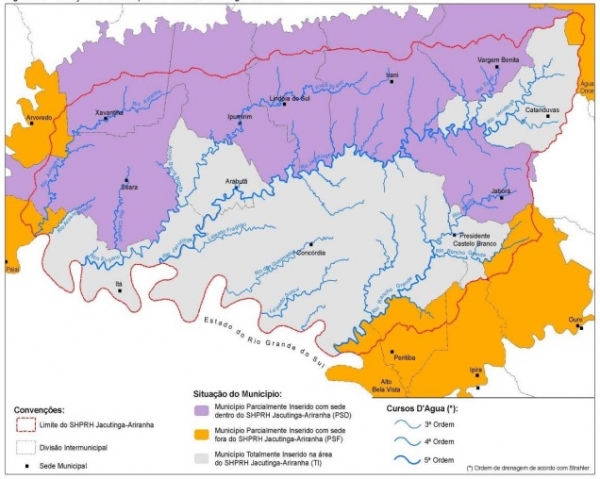 São dezenove municípios inseridos na área de abrangência do Comitê Jacutinga, categorizados em três classes: TI – Totalmente Inserido; PSD –Parcialmente Inseridos; PSF – Parcialmente Inseridos com Sede Fora da Área de abrangência do Comitê Jacutinga.