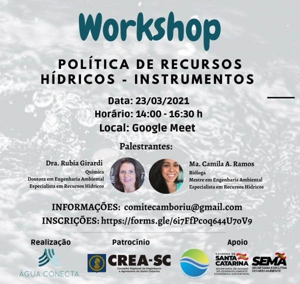 O Instituto Água Conecta em parceria com o Comitê Camboriú e patrocínio do CREA-SC, convida para o Workshop “Política de Recursos Hídricos – Instrumentos”, tendo como público-alvo os membros do Comitê Camboriú, entidades da sociedade civil, usuários de água, estudantes e demais interessados na gestão dos recursos hídricos.
