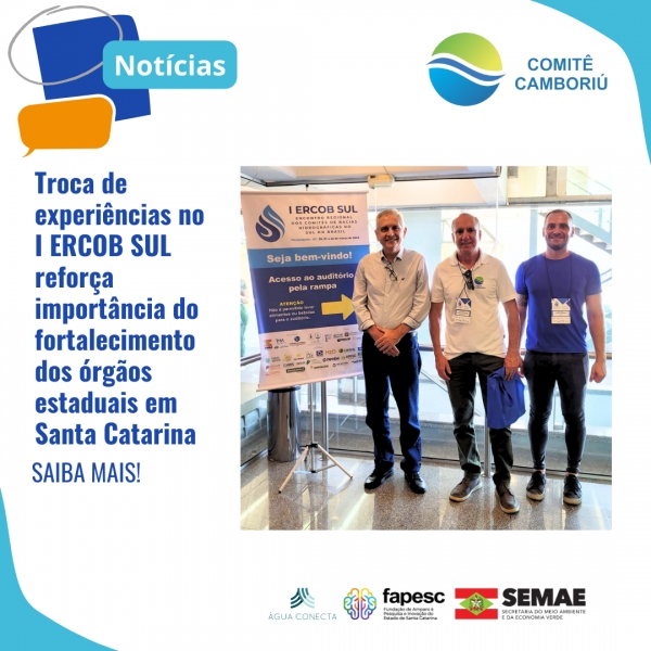 Ao longo dos três dias, o Comitê Camboriú marcou presença no ERCOB com a participação do Dr. Paulo Ricardo Schwingel, Presidente do Comitê Camboriú, do Sr. Gilmar Pedro Capelari, Secretário Executivo, e os membros Sr. Mauricio Fernandes/CREA SC e Sra. Janaina Alberti/SEMAE.