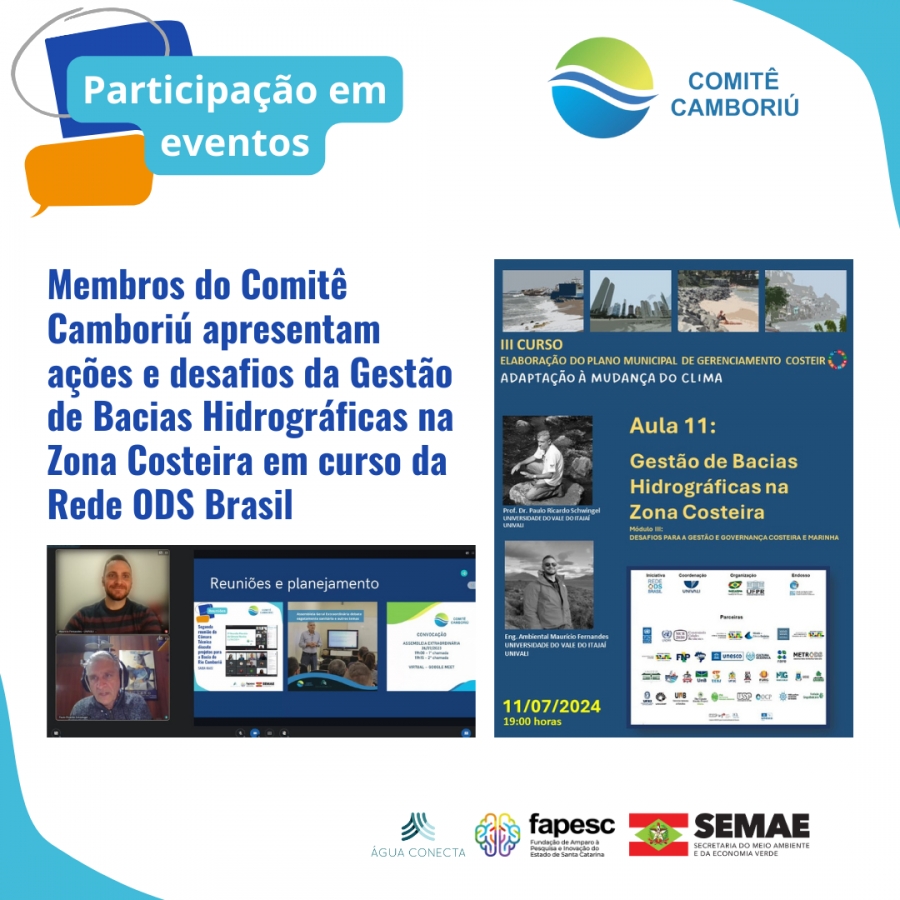No dia 11 de julho, o Prof. Dr. Paulo Ricardo Schwingel da Universidade do Vale do Itajaí (Univali), presidente do Comitê Camboriú e o Eng. Ambiental Maurício Fernandes da Universidade do Vale do Itajaí (Univali), Coordenador da Câmara Técnica do Comitê Camboriú, ministraram uma aula do 3º Curso de Elaboração do Plano Municipal de Gerenciamento Costeiro, sobre a Gestão de Bacias Hidrográficas na Zona Costeira. O curso é da``` Rede ODS Brasil e focado em gestores públicos municipais de todo o Brasil.