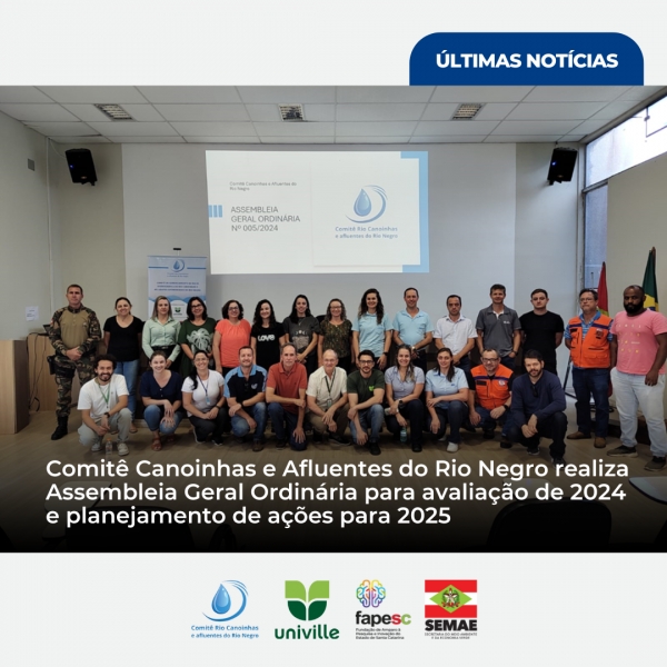 No dia 26 de novembro de 2024, o Comitê de Gerenciamento da Bacia Hidrográfica do Rio Canoinhas e Afluentes Catarinenses do Rio Negro realizou sua Assembleia Geral Ordinária Nº 005/2024, no auditório da Amplanorte, em Mafra – SC. A reunião contou com a presença de representantes das organizações-membro do Comitê, que discutiram diversos temas relevantes para a gestão dos recursos hídricos da região.