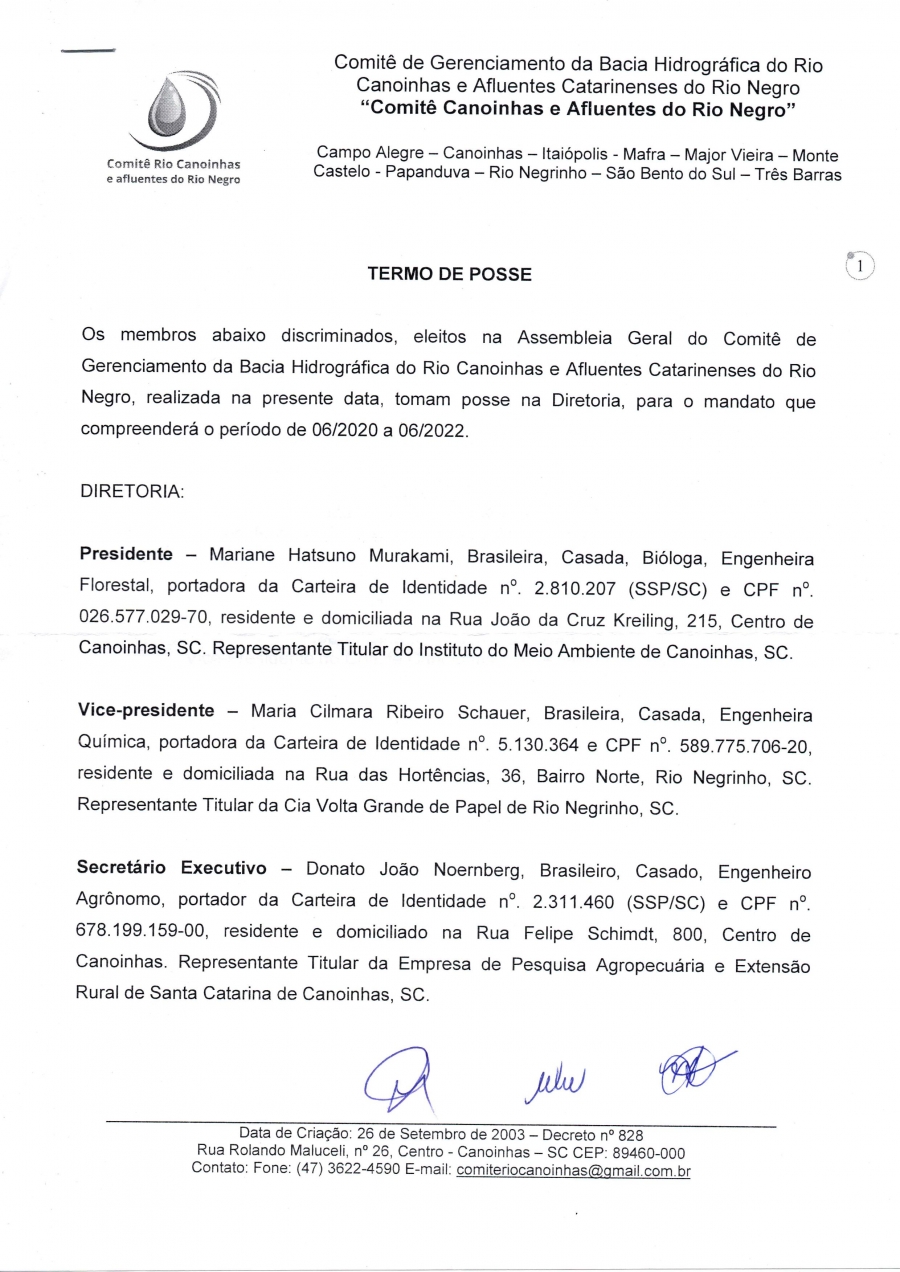 A nova diretoria do Comitê Canoinhas e Afluentes do Rio Negro foi eleita no dia 18 de junho, em Assembleia Geral Ordinária (AGO). A Chapa recebeu 28 votos e foi escolhida de forma unânime pelos membros presentes. Após a eleição, o termo de posse foi assinado. A nova diretoria ficou assim composta: