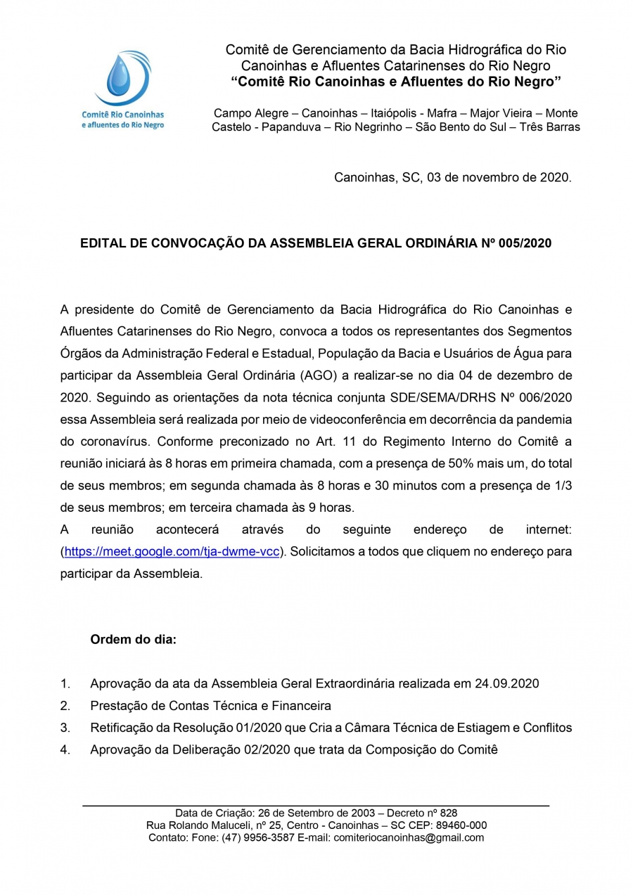 A presidente do Comitê de Gerenciamento da Bacia Hidrográfica do Rio Canoinhas e Afluentes Catarinenses do Rio Negro, convoca a todos os representantes dos Segmentos Órgãos da Administração Federal e Estadual, População da Bacia e Usuários de Água para participar da Assembleia Geral Ordinária (AGO) a realizar-se no dia 04 de dezembro de 2020. Seguindo as orientações da nota técnica conjunta SDE/SEMA/DRHS Nº 006/2020 essa Assembleia será realizada por meio de videoconferência em decorrência da pandemia do coronavírus. Conforme preconizado no Art. 11 do Regimento Interno do Comitê a reunião iniciará às 8 horas em primeira chamada, com a presença de 50% mais um, do total de seus membros; em segunda chamada às 8 horas e 30 minutos com a presença de 1/3 de seus membros; em terceira chamada às 9 horas.