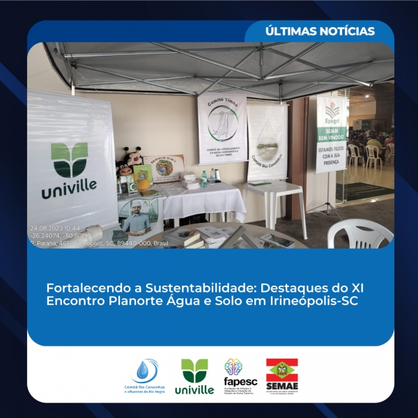 O Comitê Canoinhas e afluentes do Rio Negro participou no XI Encontro Planorte Água e Solo, realizado em Irineópolis-SC no dia 24 de agosto. O evento anual, uma colaboração entre diversas entidades, teve como objetivo fortalecer a conscientização e as práticas sustentáveis relacionadas ao manejo da água e do solo na região do Planalto Norte Catarinense.