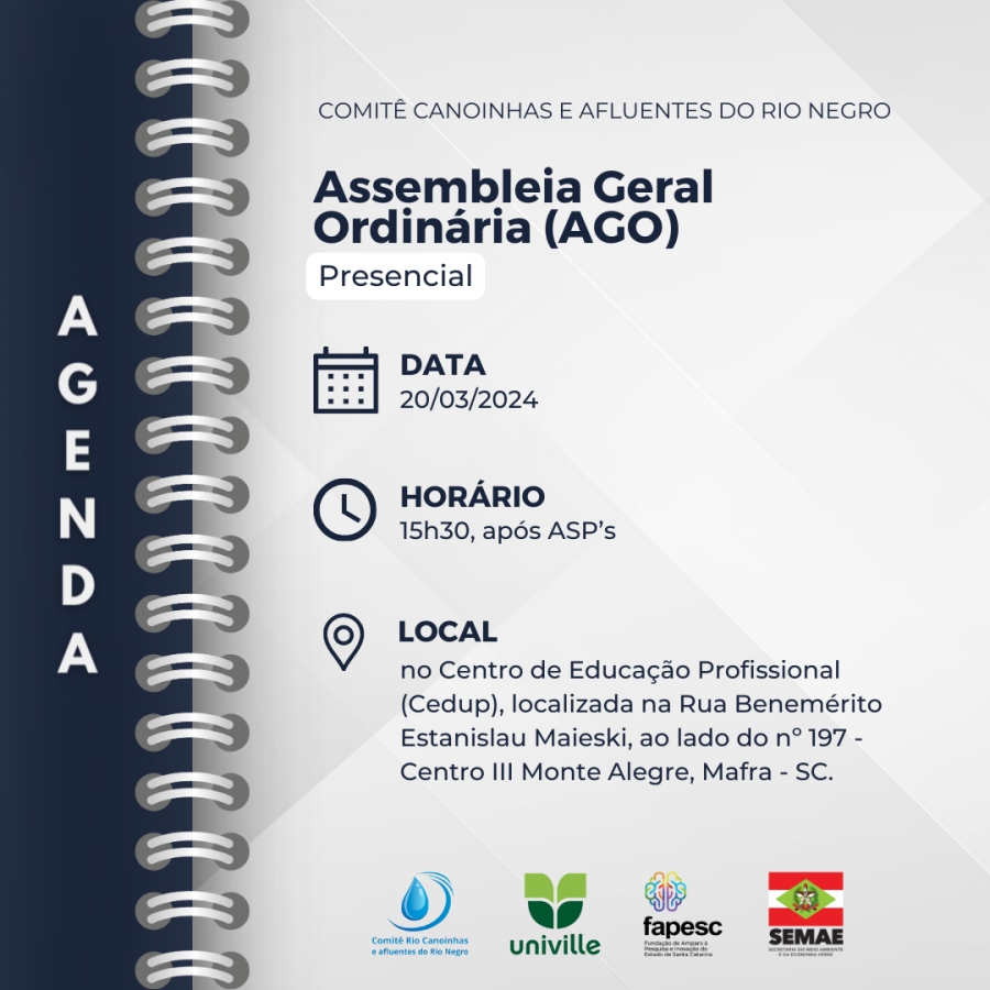 O Comitê de Gerenciamento da Bacia Hidrográfica do Rio Canoinhas e Afluentes do Rio Negro convoca as suas organizações-membro e demais interessados para participarem da nossa Assembleia Geral Ordinária, que ocorrerá dia 20/03/2024 às 15h30 no Centro de Educação Profissional (Cedup), localizada na Rua Benemérito Estanislau Maieski, ao lado do nº197 - Centro III Monte Alegre, Mafra - SC.