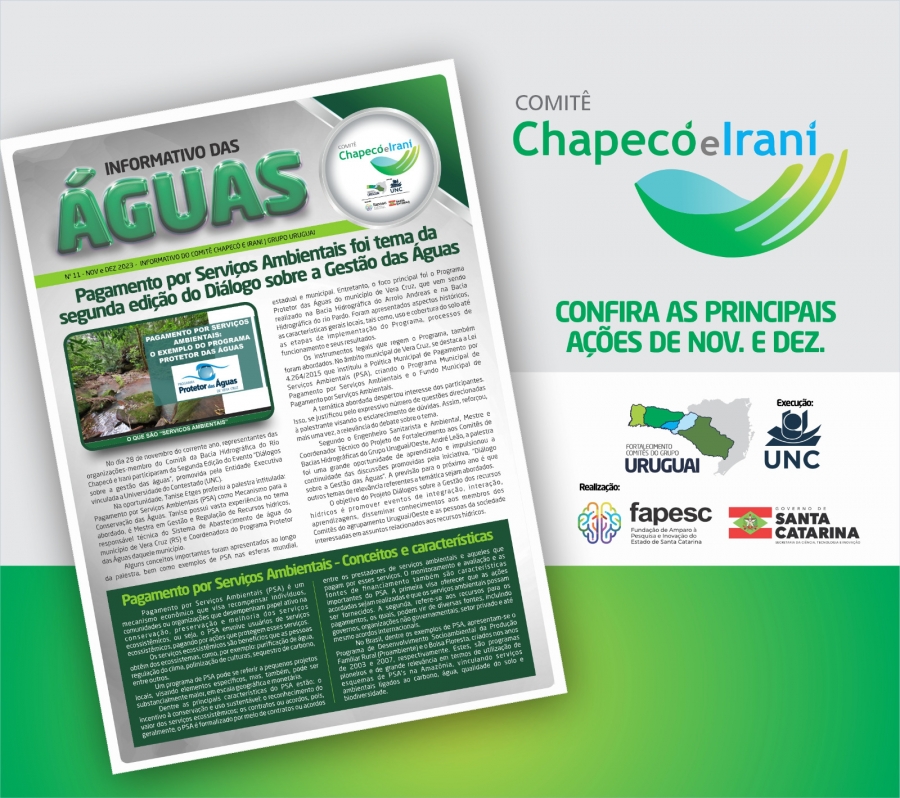 A Entidade Executiva Universidade do Contestado dentro do escopo do assessoramento do Comitê Chapecó e Irani acaba de publicar mais um informativo das águas. O material traz as principais notícias e assuntos relacionados à gestão dos recursos hídricos na área de atuação do Comitê Chapecó e Irani referente aos meses de novembro e dezembro de 2023.