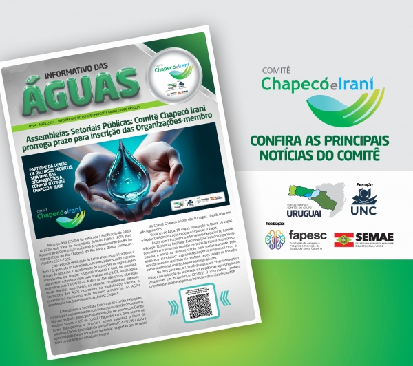 Confira o material clicando AQUI: www.aguas.sc.gov.br/jsmallfib_top/Comite%20Rio%20Chapeco/Irani/Publicacoes/Informativos%202024/Informativo--Chapeco--Irani--Numero-04.pdf e se mantenha informado sobre as questões que norteiam a gestão das águas em nossa Bacia Hidrográfica!
