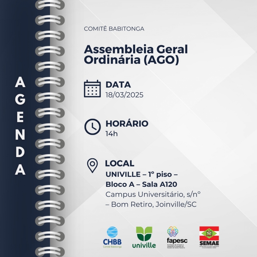 Convocamos todas as entidades pertencentes ao Comitê de Gerenciamento das Bacias Hidrográficas do Complexo Hidrológico da Baía da Babitonga e Bacias Contíguas, bem como a comunidade da região, a participarem da Assembleia Geral Ordinária. Confira o edital aqui.