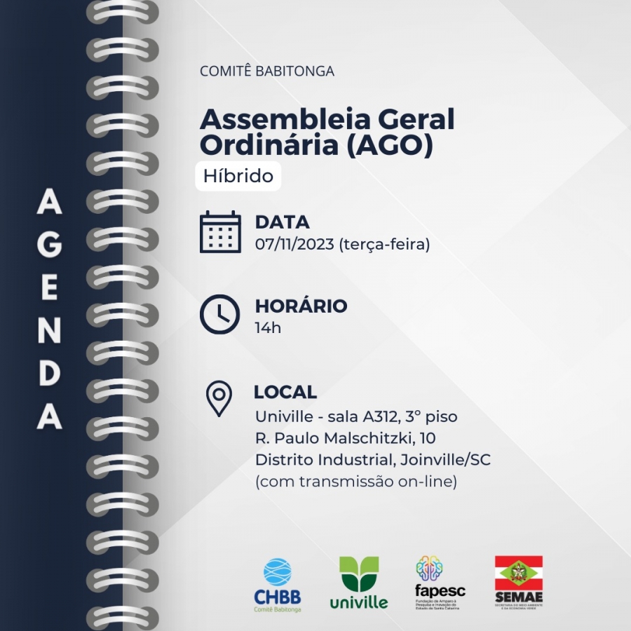 Convocamos todas as entidades pertencentes ao Comitê de Gerenciamento das Bacias Hidrográficas do Complexo Hidrológico da Baía da Babitonga e Bacias Contíguas, a participarem da Assembleia Geral Ordinária: