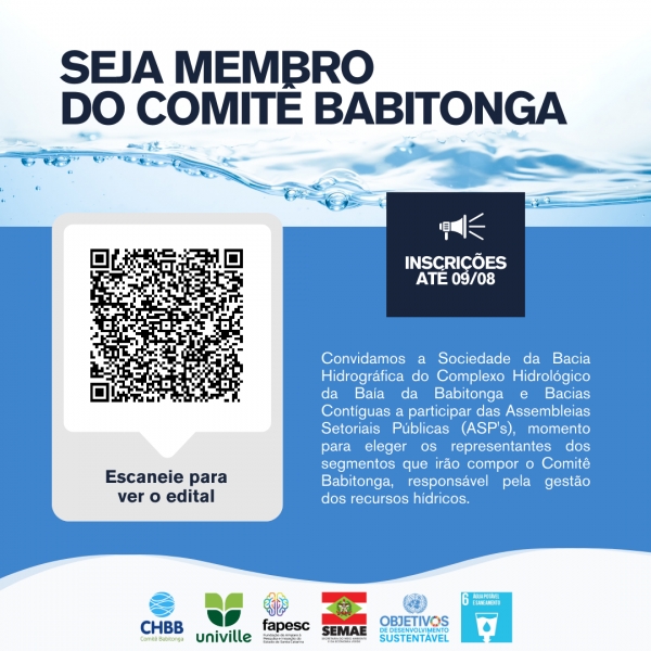 Convidamos a Sociedade da Bacia Hidrográfica do Complexo Hidrológico da Baía da Babitonga e Bacias Contíguas a participar das Assembleias Setoriais Públicas (ASP's), momento para eleger os representantes dos segmentos que irão compor o Comitê Babitonga, responsável pela gestão dos recursos hídricos.