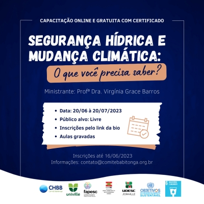 O Comitê Babitonga e sua Entidade Executiva – Univille convidam para a capacitação on-line “SEGURANÇA HÍDRICA E MUDANÇA CLIMÁTICA: O que você precisa saber?”
