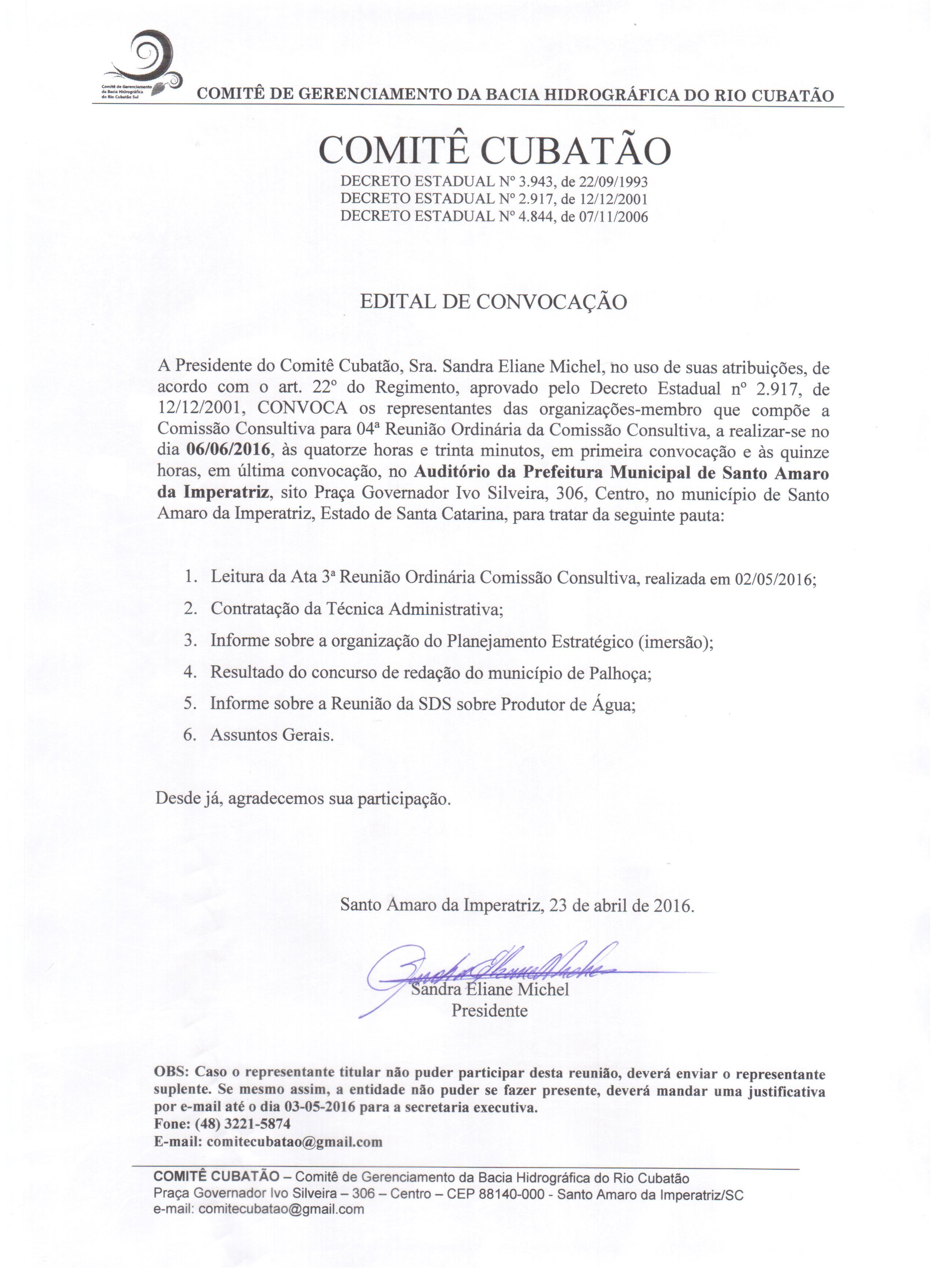 04ª Reunião Ordinária da Comissão Consultiva a realizar-se no dia 06/06/2016, às quatorze horas e trinta minutos, em primeira convocação e às quinze horas, em última convocação, no Auditório da Prefeitura Municipal de Santo Amaro da Imperatriz , situado na Praça Governador Ivo Silveira, 306, Centro, no município de Santo Amaro da Imperatriz, Estado de Santa Catarina.