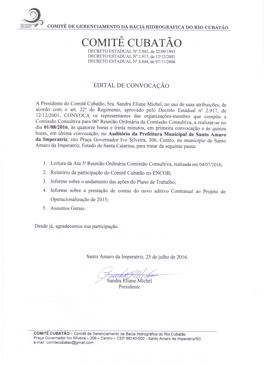 O Comitê de Gerenciamento da Bacia Hidrográfica do Rio Cubatão convoca os membros da Comissão Consultiva para a 06ª Reunião Ordinária a realizar-se no dia 01/08/2016, às quatorze horas e trinta minutos, em primeira convocação e às quinze horas, em última convocação, no Auditório da Prefeitura Municipal de Santo Amaro da Imperatriz , situado na Praça Governador Ivo Silveira, 306, Centro, no município de Santo Amaro da Imperatriz, Estado de Santa Catarina.