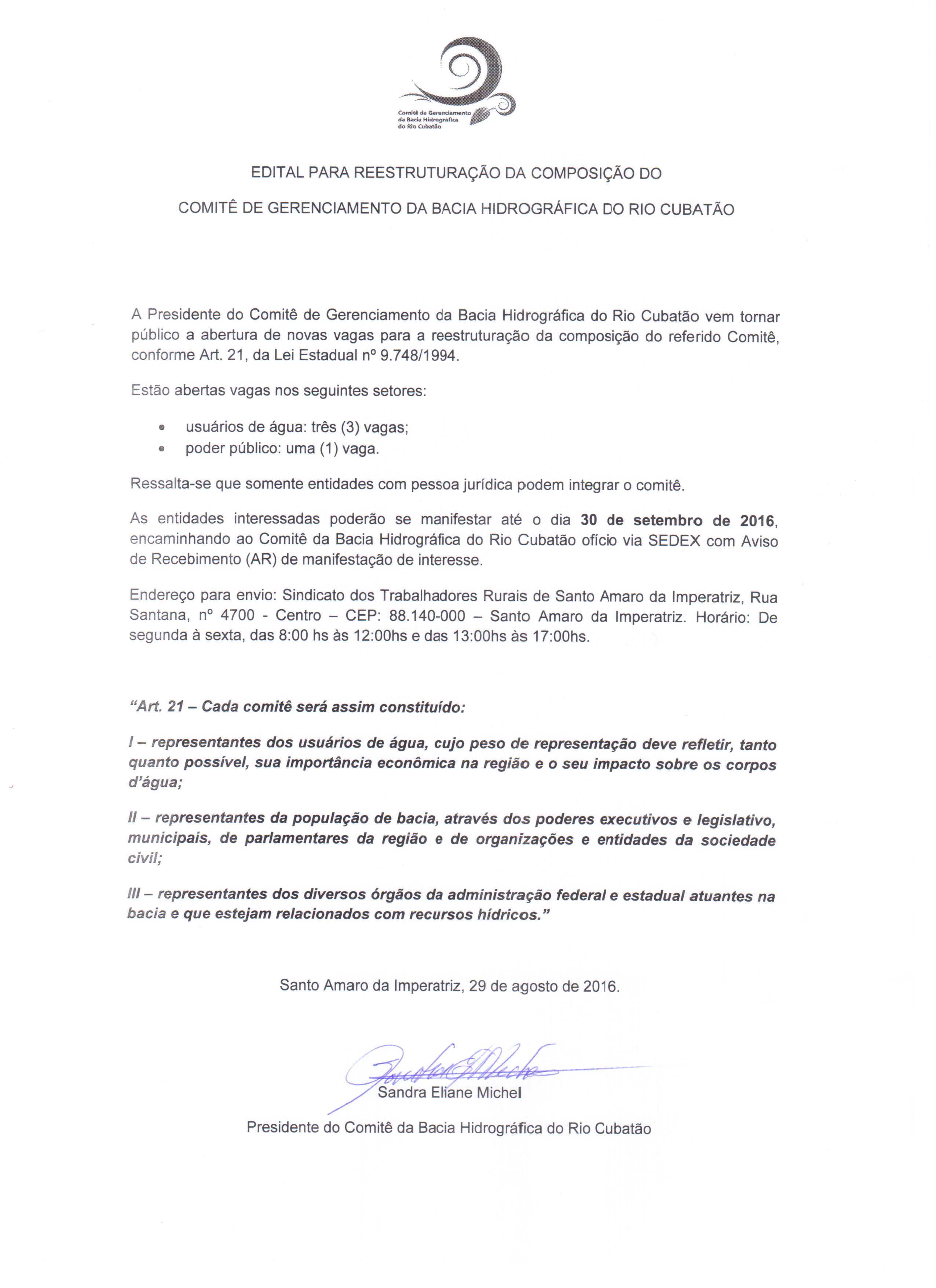 A Presidente do Comitê de Gerenciamento da Bacia Hidrográfica do Rio Cubatão vem tornar público a abertura de novas vagas para a reestruturação da composição do referido Comitê. Estão abertas vagas nos seguintes setores: usuários de água: três (3) vagas e poder público: uma (1) vaga. Ressalta-se que somente entidades com pessoa jurídica podem integrar o comitê. As entidades interessadas poderão se manifestar até o dia 30 de setembro de 2016, encaminhando ao Comitê da Bacia Hidrográfica do Rio Cubatão ofício via SEDEX com Aviso de Recebimento (AR) de manifestação de interesse.