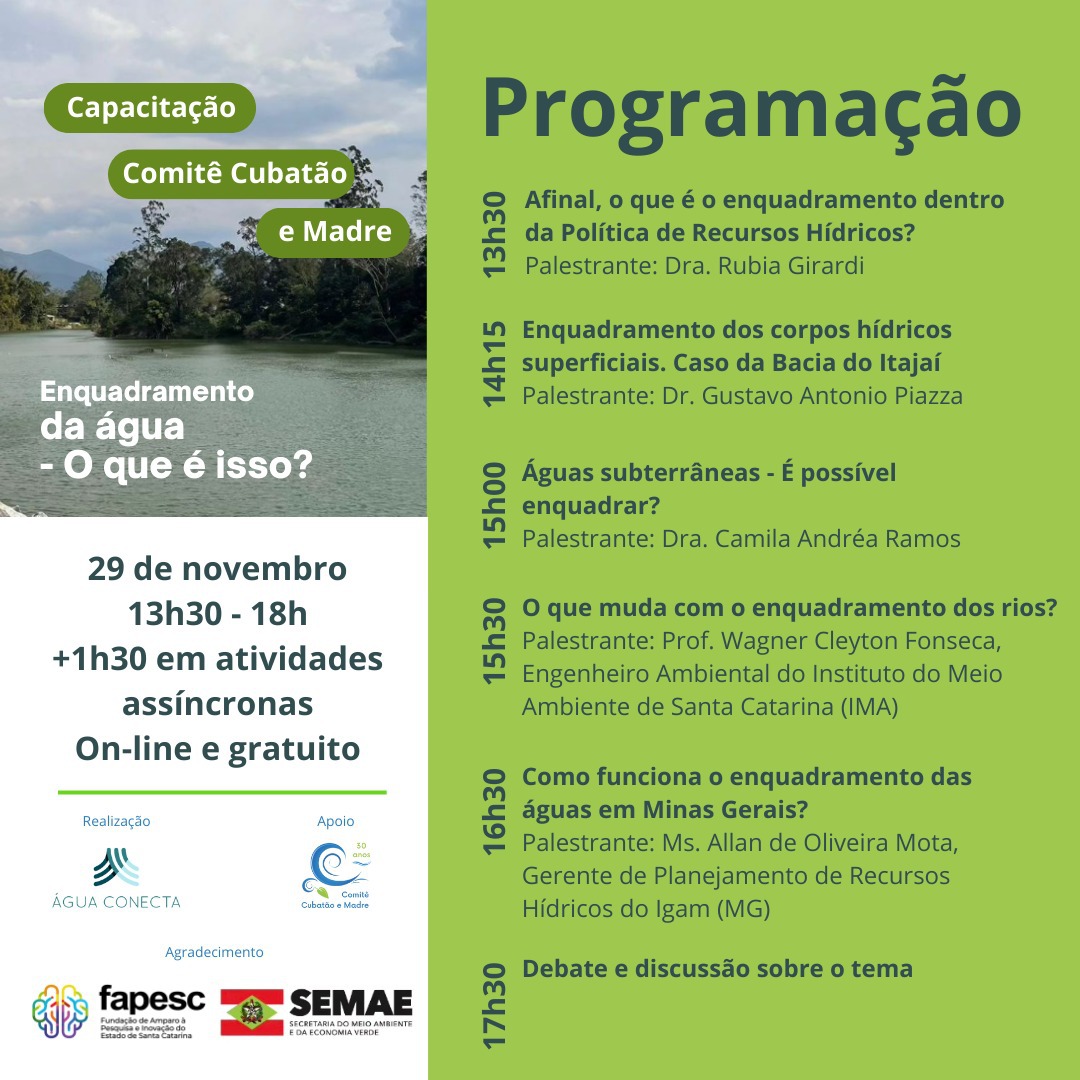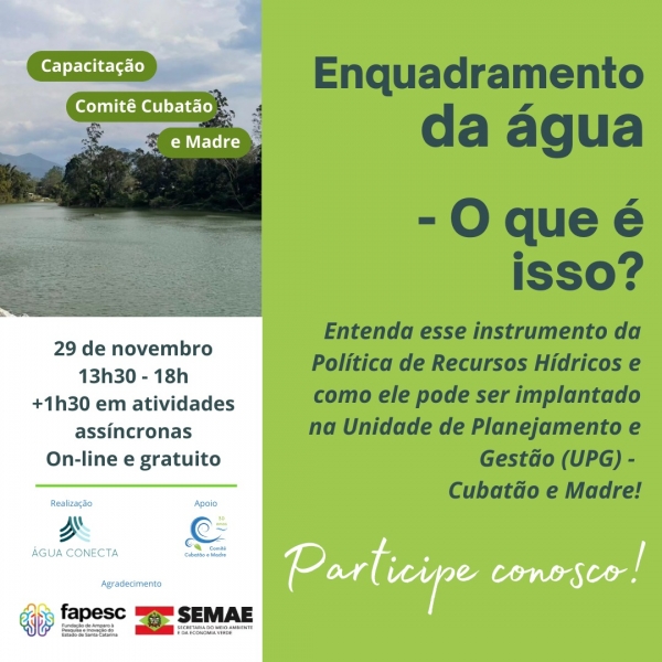 Você sabe o que é Enquadramento da Água e como ele pode ser implantado na Unidade de Planejamento e Gestão (UPG) - Cubatão e Madre? Participe da capacitação gratuita, no dia 29 de novembro, e entenda melhor esse importante instrumento da Política de Recursos Hídricos!