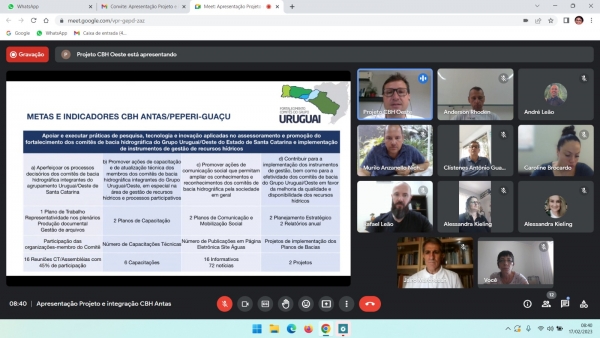 No dia 14 de fevereiro, aconteceu a primeira reunião virtual promovida pela Secretaria de Meio Ambiente do Estado, Diretorias de Comitês de Bacias Hidrográficas e Equipes das Entidades Executivas de assessoria aos Comitês de Bacias Hidrográficas do Estado de Santa Catarina. Um dos objetivos da reunião foi apresentar às Diretorias dos Comitês de Bacias Hidrográficas os componentes das Equipes Executivas que atuarão por dois anos, por meio de Técnicos, Pesquisadores e Profissionais no apoio aos Comitês de Bacia Hidrográficas.