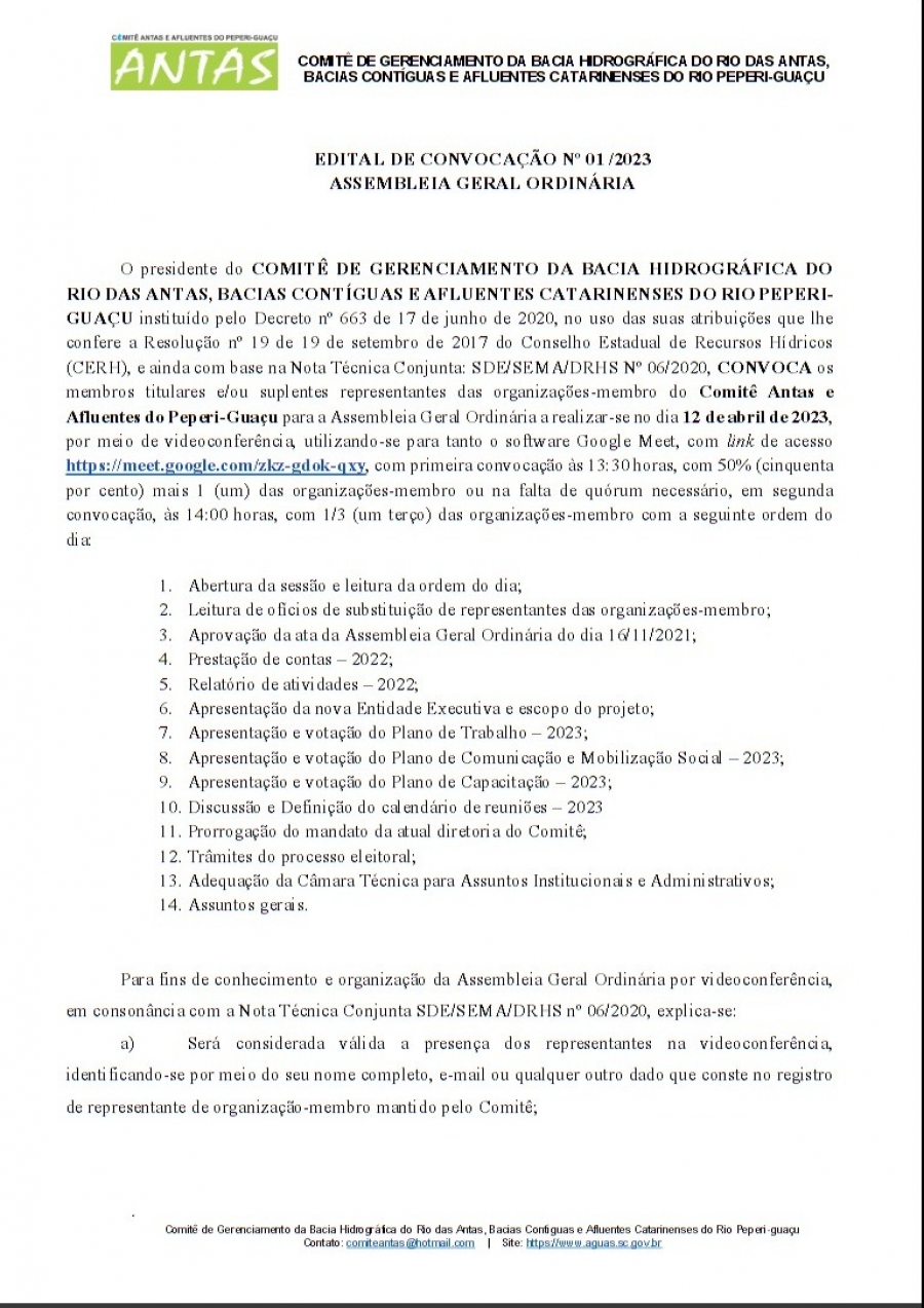 O Presidente do Comitê de Gerenciamento da Bacia Hidrográfica do Rio das Antas, Bacias Contíguas e Afluentes Catarinenses do Rio Peperi-guaçu, instituído pelo Decreto Estadual nº 663 de 17 de Junho de 2020, no uso de suas atribuições e com supedâneo na Resolução nº 19, de 19 de setembro de 2017, do Conselho Estadual de Recursos Hídricos (CERH) e ainda com base na Nota Técnica Conjunta SDE/SEMA/DRHS nº 06/2020, CONVOCA os membros titulares e/ou suplentes representantes das organizações-membro do Comitê Antas e Afluentes do Peperi-guaçu para Assembleia Geral Ordinária a realizar-se no dia 12 de abril de 2023, por meio de videoconferência, utilizando-se para t anto o software Google Meet, com primeira convocação às 13:30 horas com 50% (cinquenta por cento) mais 1 (um) das organizações-membro ou na falta de quórum necessário em segunda convocação às 14:00 horas, com 1/3 (um terço) das organizações-membro.