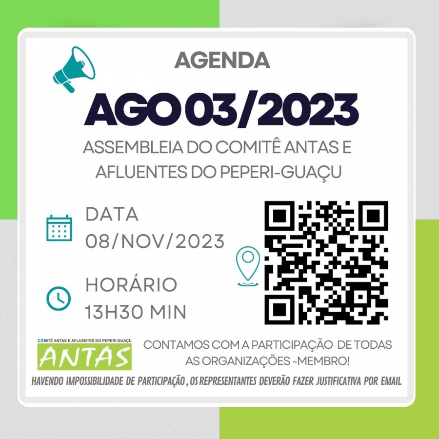 O presidente do Comitê de Gerenciamento da Bacia Hidrográfica do Rio das Antas, Bacias Contíguas e Afluentes Catarinenses do Rio Peperi-guaçu, instituído pelo Decreto Estadual nº 663 de 17 de Junho de 2020, no uso de suas atribuições e com supedâneo na Resolução nº 19, de 19 de setembro de 2017, do Conselho Estadual de Recursos Hídricos (CERH) e ainda com base na Nota Técnica Conjunta SDE/SEMA/DRHS nº 06/2020, CONVOCA os membros titulares e/ou suplentes representantes das organizações-membro do Comitê Antas e Afluentes do Peperi-guaçu para Assembleia Geral Ordinária a realizar-se no dia 08 de novembro de 2023, por meio de videoconferência, utilizando-se para tanto o software Google Meet, com primeira convocação às 13:30 horas com 50% (cinquenta por cento) mais 1 (um) das organizações-membro ou na falta de quórum necessário em segunda convocação às 14:00 horas, com 1/3 (um terço) das organizações-membro.