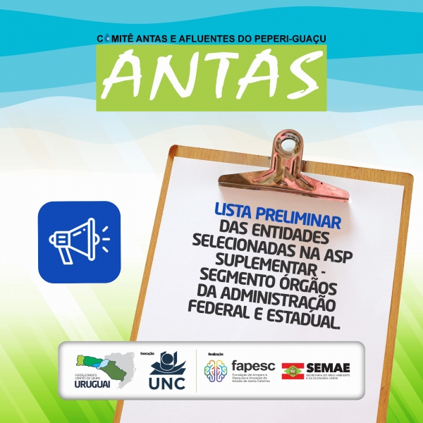A lista contendo a entidade selecionada e a entidade da lista de espera está disponível no link: https://www.aguas.sc.gov.br/jsmallfib_top/Comite%20Rio%20das%20Antas/Legislacoes/Comite/editais/2024/Lista_preliminar_de_entidades_selecionadas_ASP_suplementar_assinado.pdf