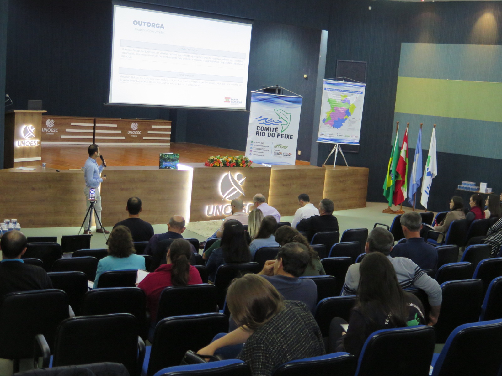Na última quarta (04), foi realizado o XV Fórum do Comitê Peixe. Com o tema “Outorga de Direito de Uso da Água: da legislação ao processo de obtenção”, o evento reuniu mais de 60 pessoas de diversos municípios. O Fórum aconteceu no auditório da UNOESC Videira, e contou ainda com a presença de representantes da Gerência de Outorga e Gerência de Saneamento e Gestão de Recursos Hídricos da Secretaria de Meio Ambiente e Economia Verde (SEMAE) do governo de Santa Catarina, prefeitos, secretários municipais, extensionistas da EPAGRI, técnicos da área ambiental, representantes de cooperativas de crédito rural e entusiastas do assunto.