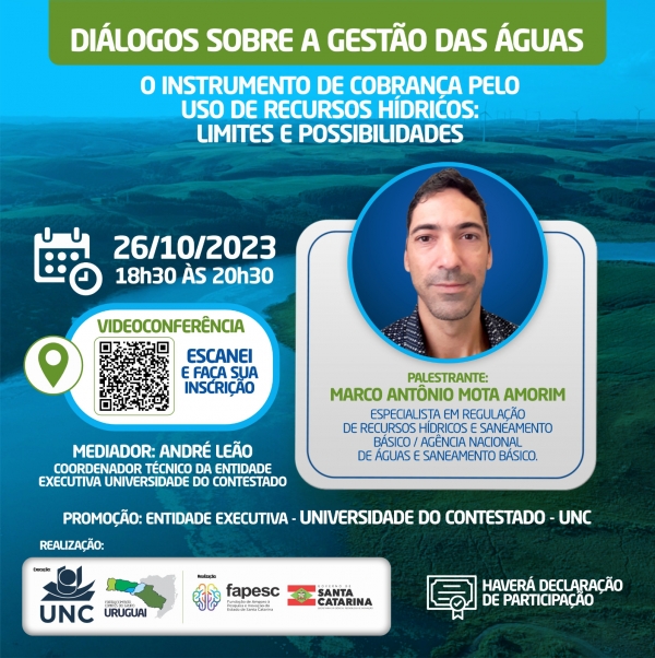 A programação prevê palestra com Marco Antônio Mota Amorim, Especialista em Regulação de Recursos Hídricos e Saneamento Básico da Agência Nacional de Águas e Saneamento Básico - ANA. Ele abordará o tema: “Cobrança pelo Uso de Recursos Hídricos - Limites e Possibilidades”. O link para inscrição é https://forms.gle/JyEW5kK51i6rmnFSA.