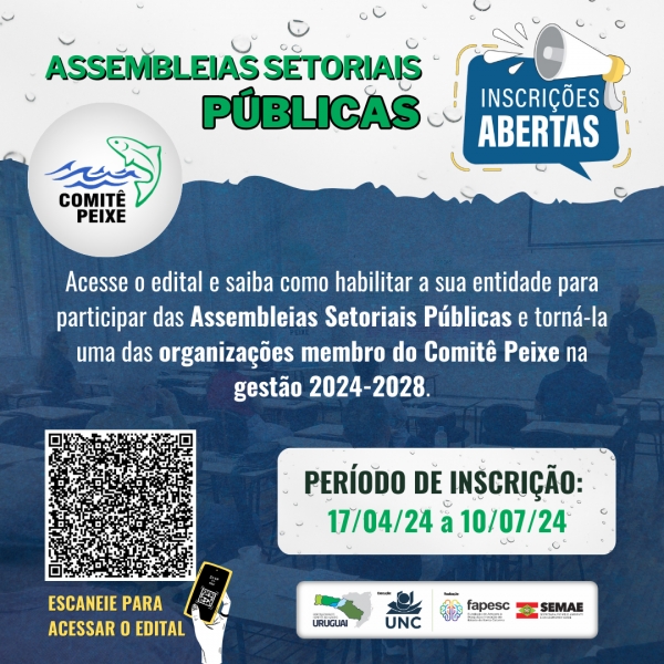 As inscrições ficarão abertas no período de 17 de abril a 10 de julho de 2024. As organizações, órgãos ou entidades interessadas em habilitar-se para concorrer a uma vaga no Comitê Peixe, deverão inscrever-se exclusivamente pelo e-mail “ O endereço de e-mail address está sendo protegido de spambots. Você precisa ativar o JavaScript enabled para vê-lo. ”, mediante o envio dos documentos indicados no edital, digitalizados em formato PDF. A habilitação para participação nas ASPs é condicionada ao recebimento, no prazo previsto, e análise pela Secretaria Executiva do Comitê de todos os documentos.