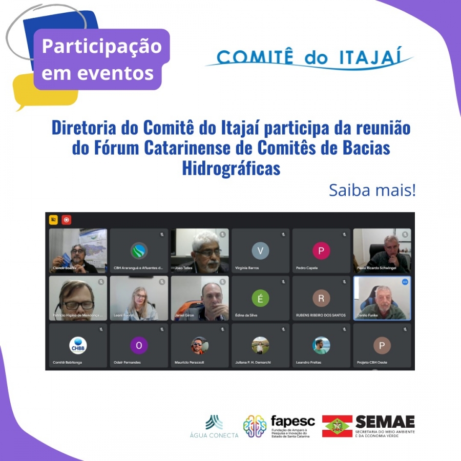 No dia 10 de outubro, o Presidente do Comitê do Itajaí, Odair Fernandes, e o secretário executivo, Leandro freitas, participaram da reunião do Fórum Catarinense de Comitês de Bacias Hidrográficas (FCCBH), que aconteceu no formato virtual.