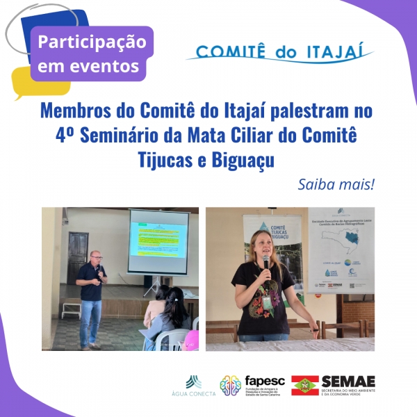 Nesta terça-feira, dia 29 de outubro, foi realizado o 4º Seminário da Mata Ciliar em Angelina, promovido pelo Instituto Água Conecta e o Comitê Tijucas e Biguaçu. O evento com palestras sobre ações de proteção e restauração das Áreas de Preservação Permanente (APPs) de mata ciliar e como gerar renda a partir disso.