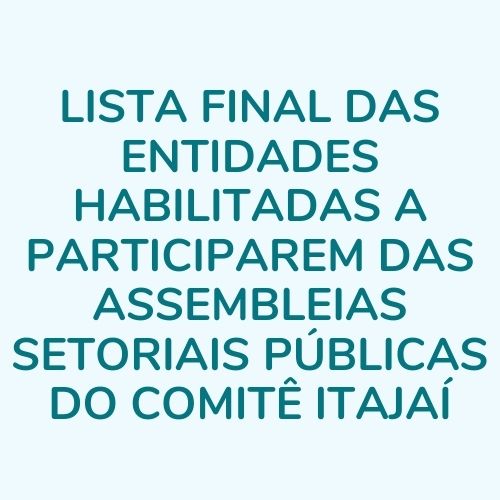 O Presidente do Comitê de Gerenciamento da Bacia Hidrográfica do Rio Itajaí e bacias contíguas, doravante denominado Comitê Itajaí, Sr. Odair Fernandes, TORNA PÚBLICO A LISTA FINAL DAS ENTIDADES HABILITADAS À PARTICIPAREM DA CONVOCAÇÃO DAS ASSEMBLEIAS SETORIAIS PÚBLICAS PARA RENOVAÇÃO DA COMPOSIÇÃO DO COMITÊ ITAJAÍ GESTÃO 2022 -2026 conforme o EDITAL DE CONVOCAÇÃO DAS ASSEMBLEIAS SETORIAIS PÚBLICAS, publicado no Sistema de Informações de Recursos Hídricos do Estado de Santa Catarina – SIRHESC em 25 de Novembro de 2021 e disponível em: www.aguas.sc.gov.br/o-comite-rio-itajai/inicial-rio-itajai