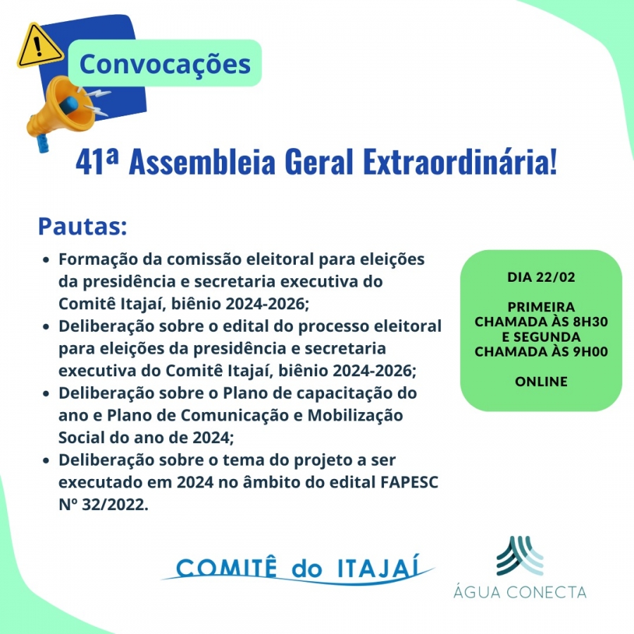 No dia 22 de fevereiro, acontecerá a 41ª AGE do Comitê do Itajaí. Entre os temas a serem discutidos está a nova comissão eleitoral para as eleições do biênio 2024-2026, que definirá o novo Presidente, Vice Presidente e Secretário-Executivo do Comitê do Itajaí. Também ocorrerão as deliberações sobre o Plano de capacitação, do Plano de Comunicação e Mobilização Social de 2024.