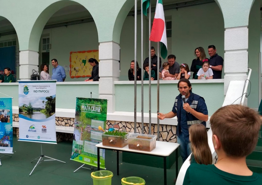 O consultor do Comitê Itapocu, Felipe Augusto, apresentou no último sábado (28) mais uma palestra sobre a Bacia Hidrográfica do Rio Itapocu e a importância das árvores para a produção de água. O encontro aconteceu no Colégio Bom Jesus, onde alunos e pais puderam aprender um pouco mais sobre a nossa Bacia Hidrográfica e também observar por meio do experimento da Mata Ciliar a importância das florestas para os recursos hídricos. A ação fez parte da programação de encerramento da Festa Anual das Árvores realizado pela Samae e parceiros.