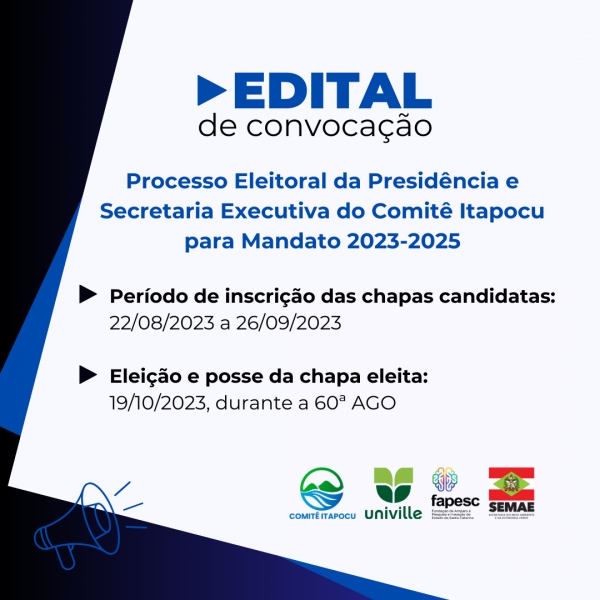 - A eleição e posse da chapa eleita ocorrerá durante a 60ª Assembleia Geral Ordinária do Comitê Itapocu no dia 19/10/2023.