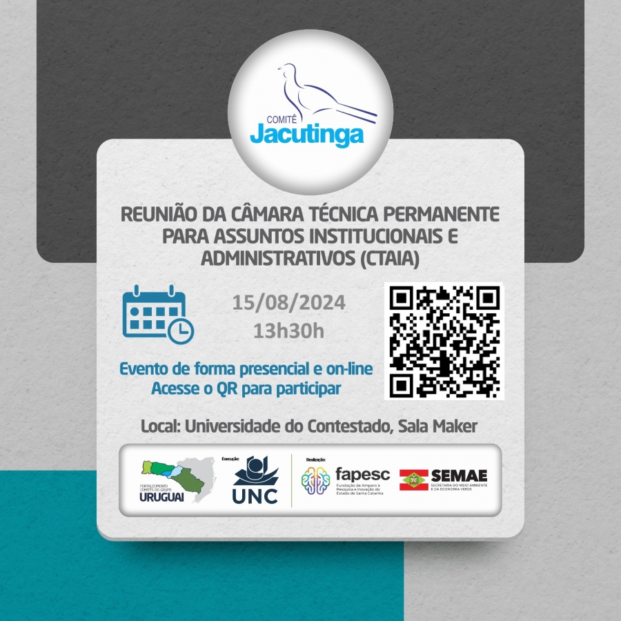 No próximo dia 15 de agosto, às 13h30, será realizada reunião da Câmara Técnica para Assuntos Institucionais e Administrativos (CTAIA) do Comitê Jacutinga. O encontro acontecerá presencialmente, tendo como local a Universidade do Contestado – Campus Concórdia, sala maker e virtualmente através do software Google Meet com link de acesso https://meet.google.com/txy-fdaf-usi
