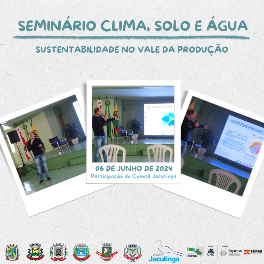 Na última quinta, 6 de junho, foi realizada no município de Ipumirim a terceira edição do Seminário Clima, Solo e Água: Sustentabilidade no Vale da Produção. A iniciativa é fruto de uma parceria entre as prefeituras da região e contou com a participação do Comitê Jacutinga em um dos importantes painéis apresentados.