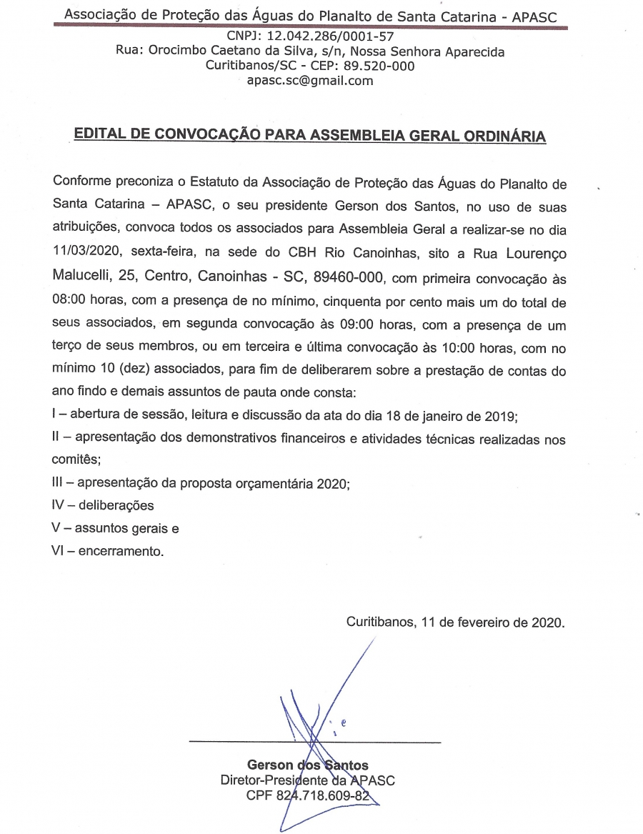 Conforme preconiza o Estatuto da Associação de Proteção das Águas do Planalto de Santa Catarina – APASC, o seu presidente Gerson dos Santos, no uso de suas atribuições, convoca todos os associados para Assembleia Geral a realizar-se no dia 11/03/2020, sexta-feira, na sede do CBH Rio Canoinhas, sito a Rua Lourenço Malucelli, 25, Centro, Canoinhas - SC, 89460-000, com primeira convocação às 08:00 horas, com a presença de no mínimo, cinquenta por cento mais um do total de seus associados, em segunda convocação às 09:00 horas, com a presença de um terço de seus membros, ou em terceira e última convocação às 10:00 horas, com no mínimo 10 (dez) associados, para fim de deliberarem sobre a prestação de contas do ano findo e demais assuntos de pauta onde consta: