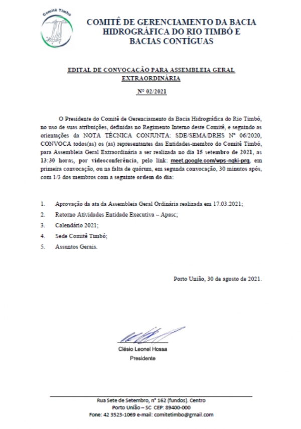 O Presidente do Comitê de Gerenciamento da Bacia Hidrográfica do Rio Timbó, no uso de suas atribuições, definidas no Regimento Interno deste Comitê, e seguindo as orientações da NOTA TÉCNICA CONJUNTA: SDE/SEMA/DRHS Nº 06/2020, CONVOCA todos(as) os (as) representantes das Entidades-membro do Comitê Timbó, para Assembleia Geral Extraordinária a ser realizada no dia 15 setembro de 2021, as 13:30 horas, por videoconferência, pelo link: meet.google.com/wps-nqki-prq, em primeira convocação, ou na falta de quórum, em segunda convocação, 30 minutos após, com 1/3 dos membros com a seguinte ordem do dia: