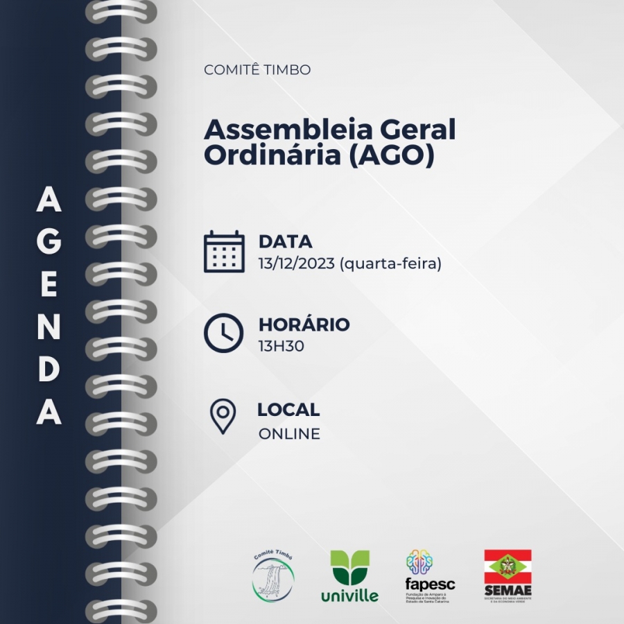 O Comitê de Gerenciamento da Bacia Hidrográfica do Rio Timbó e Bacias Contíguas convoca as suas organizações-membro e demais interessados para participarem da nossa Assembleia Geral Ordinária, que ocorrerá dia 13/12/2023 às 13h30 de forma online.