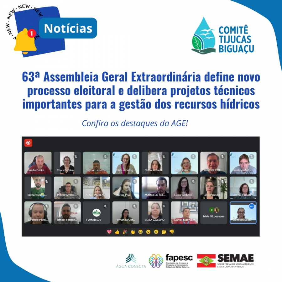 Nessa terça-feira, dia 10 de setembro, foi realizada a 63ª Assembleia Geral Extraordinária do Comitê Tijucas e Biguaçu, online, com ampla participação dos representantes das entidades-membro. No total, foram 24 organizações-membro participantes, de um total de 35 que compõem a Assembleia Geral do Comitê.