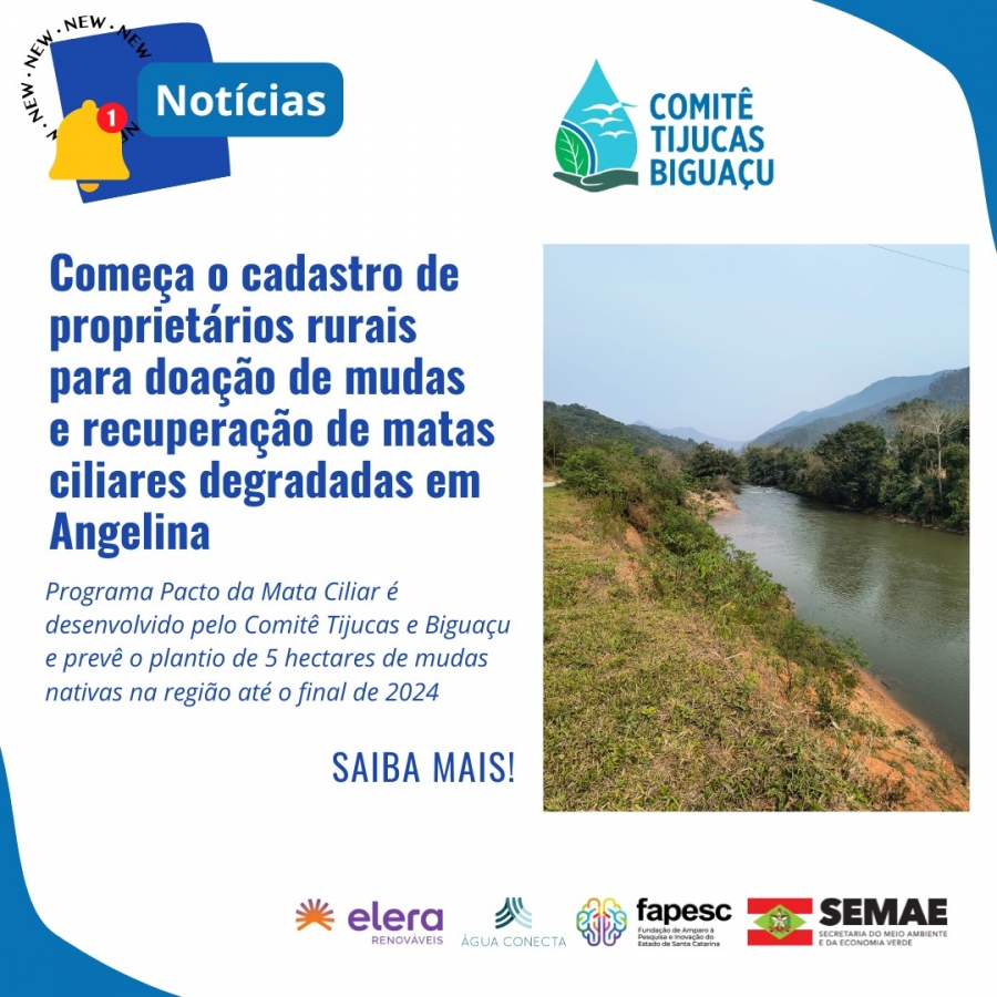 Proprietários rurais de Angelina que possuem áreas de mata ciliar degradadas já podem se inscrever no projeto Pacto da Mata Ciliar. O projeto oferece gratuitamente mudas de árvores nativas e orientação técnica para o plantio. A meta é plantar mais de 4.500 mudas. Com a expansão das áreas de mata ciliar, é esperada a redução dos riscos de erosão e deslizamentos de terra, além da melhoria na qualidade das águas no município. O projeto é uma iniciativa do Comitê Tijucas e Biguaçu, com execução do Instituto Água Conecta e patrocínio da empresa Elera Renováveis, proprietária da PCH Angelina.