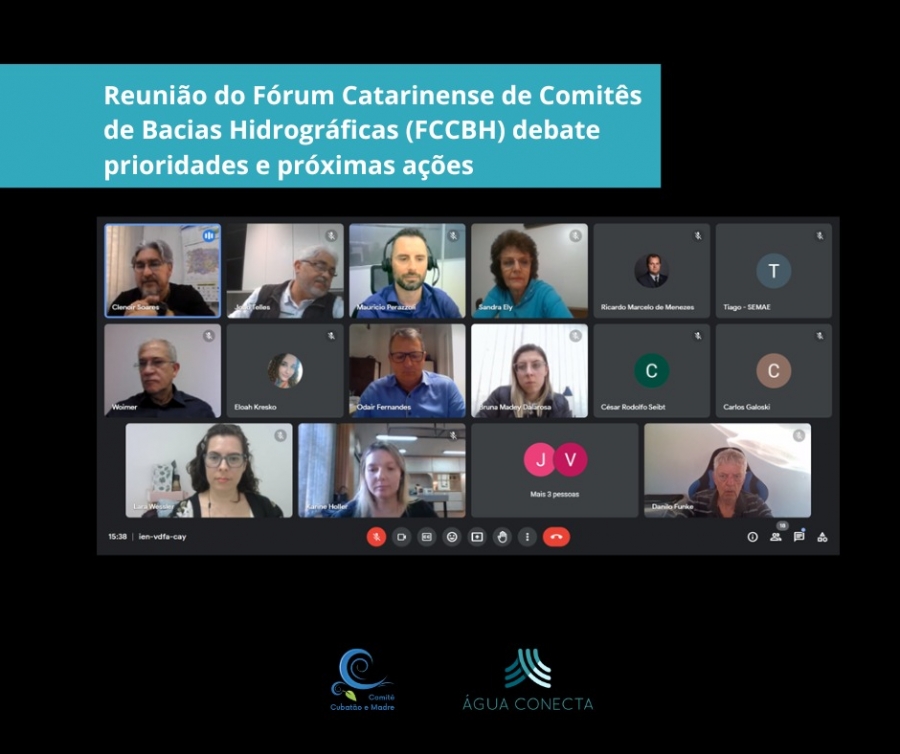 Foi realizada na última quarta-feira, dia 28 de junho, um encontro on-line do Fórum Catarinense de Comitês de Bacias Hidrográficas (FCCBH), que reuniu presidentes, vice-presidentes e secretários executivos dos 16 Comitês de Bacias Hidrográficas de Santa Catarina. Danilo da Silva Funke, presidente interino do Comitê Tijucas e Biguaçu, participou do encontro representando o Comitê Tijucas e Biguaçu. O Comitê Tijucas e Biguaçu integra a coordenação deste Fórum, no mandato atual.