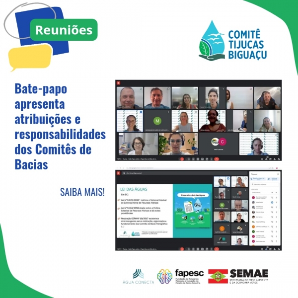 Foi realizada nessa quarta-feira, dia 8 de maio, uma roda de conversa e apresentação sobre os principais papéis dos Comitês de Bacia Hidrográfica, além da explicação geral sobre a Lei das Águas. Durante a reunião, os participantes de diferentes Comitês, além do Comitê Tijucas e Biguaçu, puderam entender as diferenças de atuação entre uma entidade delegatária e uma entidade executiva. As atribuições principais de um Comitê de Bacia Hidrográfica, são: