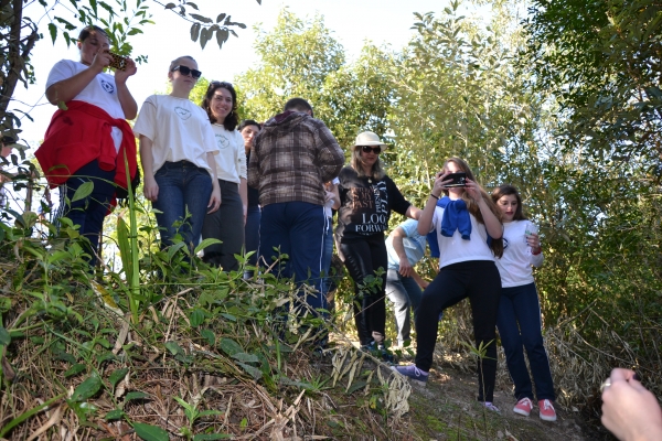 Mas foi preciso botar a mão na massa também. Os estudantes ajudaram a fazer o plantio de mudas de espécies nativas na área cercada e protegida onde fica a nascente.