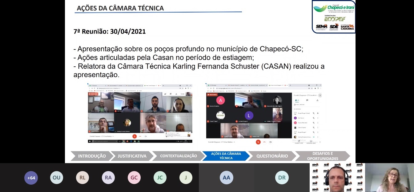 Na oportunidade, também ocorreu a apresentação e repasse de informes aos representantes das entidades que integram o Comitê Urussanga sobre as ações desenvolvidas pela Entidade Executiva Aguar, por meio do Termo de Fomento 001/2021 FEHIDRO/SDE/AGUAR, no período de 29 de setembro de 2021 a 31 de março de 2022.